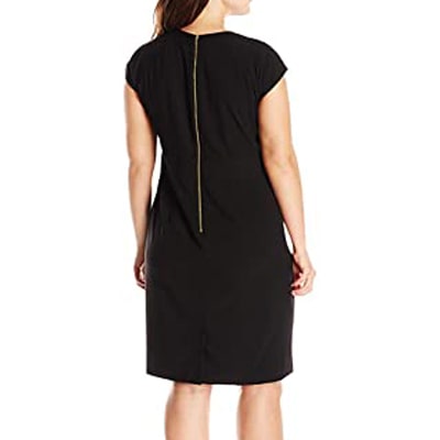 This dress has everything! Enough stretch to be forgiving. Works for my hourglass/pear shape just fine. The cap sleeves satisfy conservative dressing requirements (no sleeveless) but still works for spring/summer.